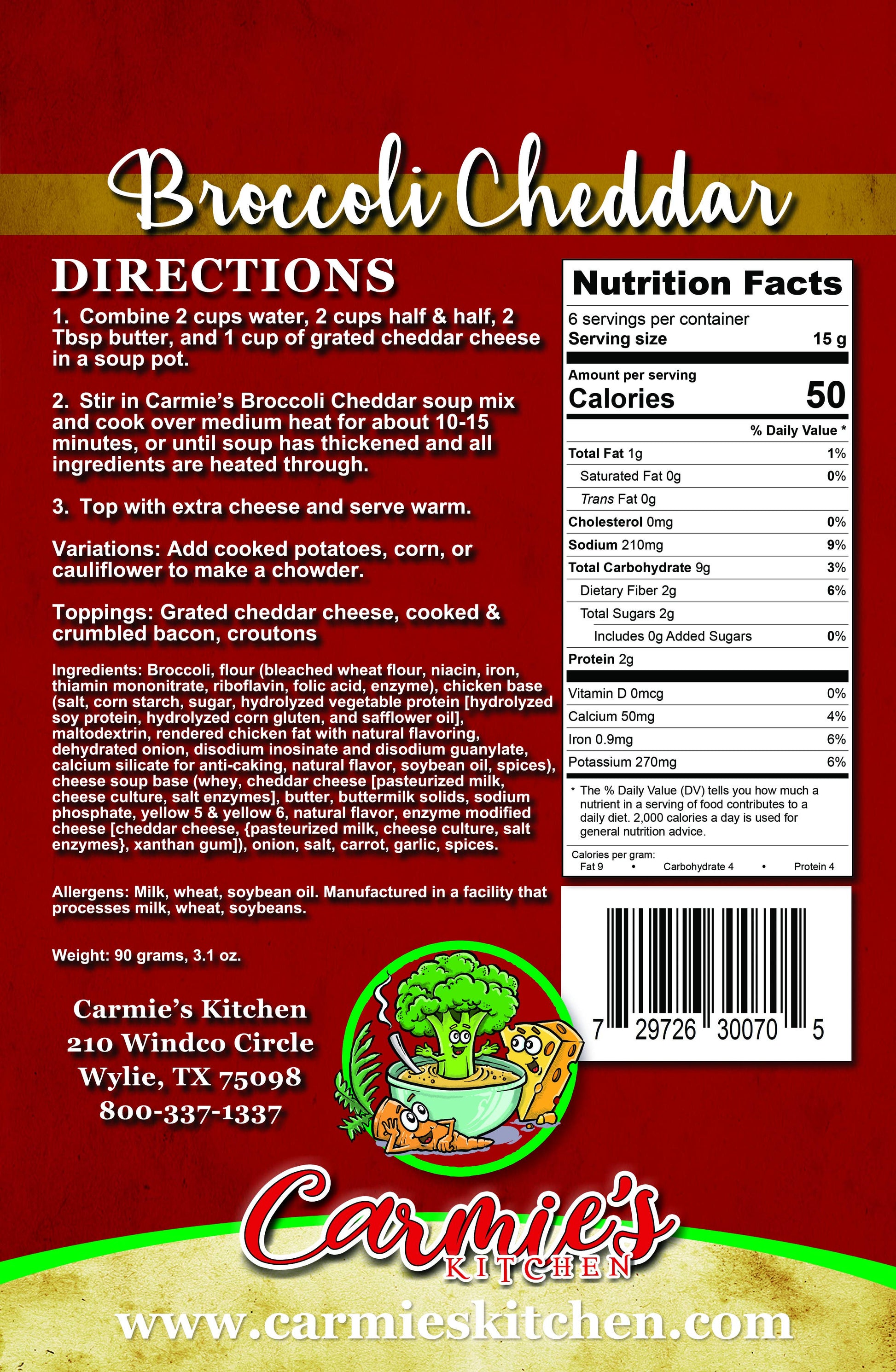Creamy and cheesy, our Broccoli Cheddar soup mix is the ultimate in comfort food. By adding just a few simple ingredients, you can have a homemade delicious soup in minutes! Serve with hunks of bread and extra cheese on top-yum! Carmie's soup mixes make the perfect stocking stuffer, hostess gift, holiday gift, or holiday party addition!
